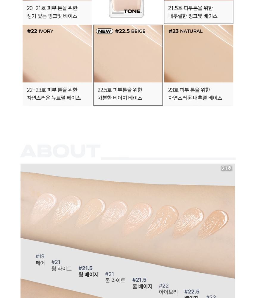 تأتي درجة #22.5 Beige بلون بيج هادئ وطبيعي، يناسب أصحاب البشرة ذات النبرة المحايدة/الصفراء الفاتحة–المتوسطة، ويمنحك مظهرًا موحدًا وناعمًا من أول طبقة.