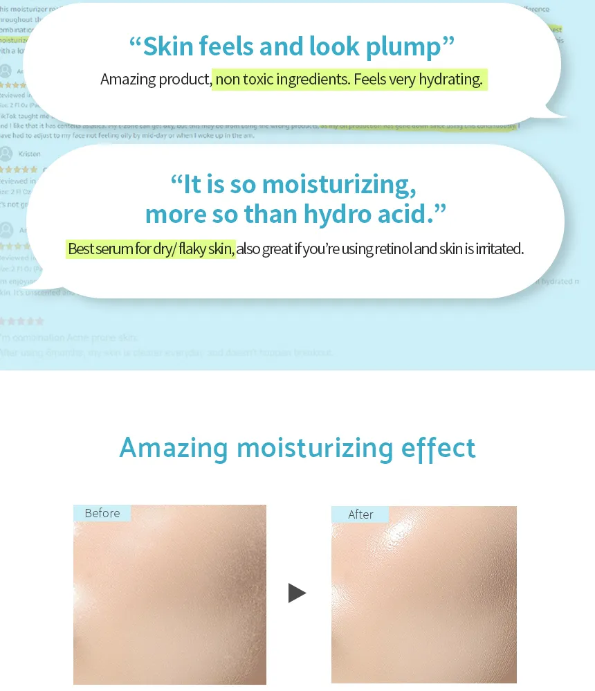 سيروم مرطب عميق غني بنسبة 400,000ppm من البيتا-جلوكان، المعروف بقدرته العالية على الاحتفاظ بالرطوبة أكثر من حمض الهيالورونيك، مما يمنح البشرة ترطيبًا طويل الأمد وملمسًا ناعمًا ومشدودًا.