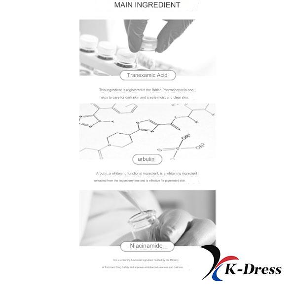 يحتوي على Tranexamic Acid بتركيز 1000ppm المعروف بقدرته على كبح إنتاج الميلانين وتهدئة الالتهابات الجلدية المرتبطة بالتصبغ، مما يساهم في تفتيح البشرة بشكل تدريجي وآمن.