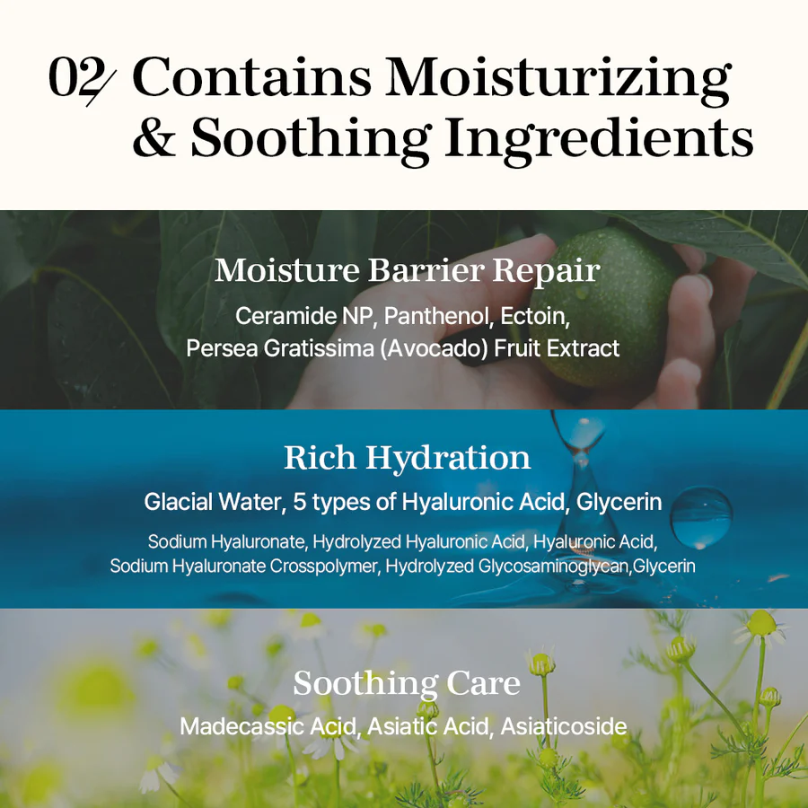 غني بمكونات ترميمية فعالة مثل السيراميد NP والبانثينول التي تعمل على تقوية حاجز البشرة الطبيعي ومنع فقدان الرطوبة. إلى جانب مياه الأنهار الجليدية وخليط من خمسة أنواع من الهيالورونيك أسيد التي تتغلغل في طبقات الجلد لتمنحك ترطيبًا طويل الأمد ونضارة ملموسة.