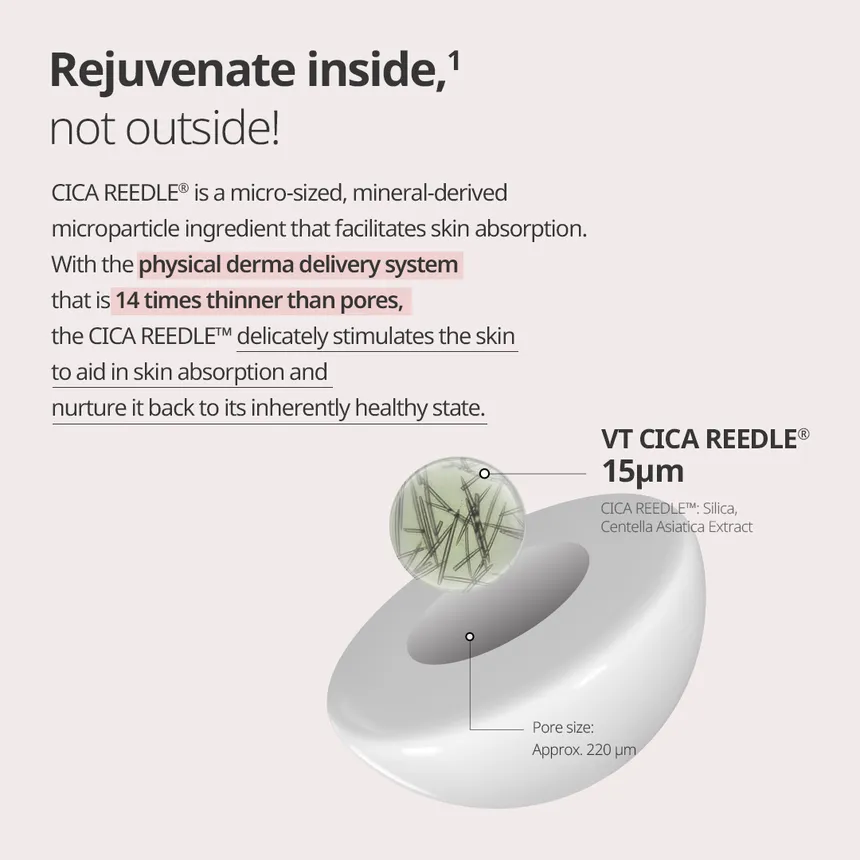 تستخدم تقنية Cica Reedle™ الدقيقة (إبر دقيقة مستخلصة من مكونات طبيعية) لتحفيز امتصاص السيروم بعمق داخل الجلد.