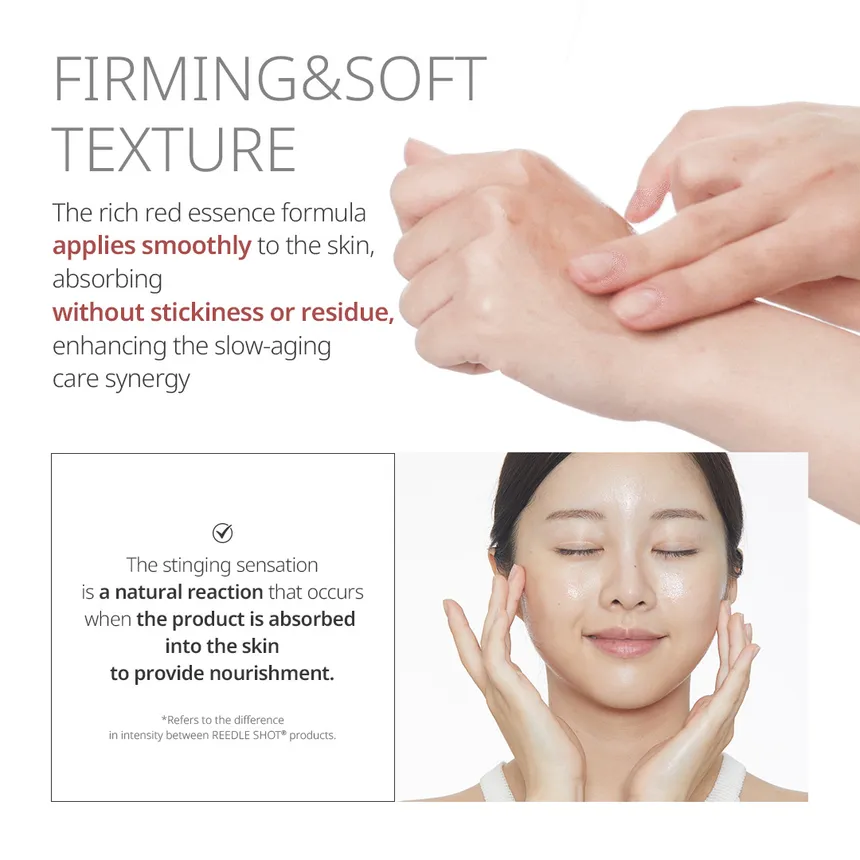 في روتين العناية الليلي، ضعي كمية مناسبة من Red Booster Reedle Shot 300 على بشرة نظيفة وجافة.